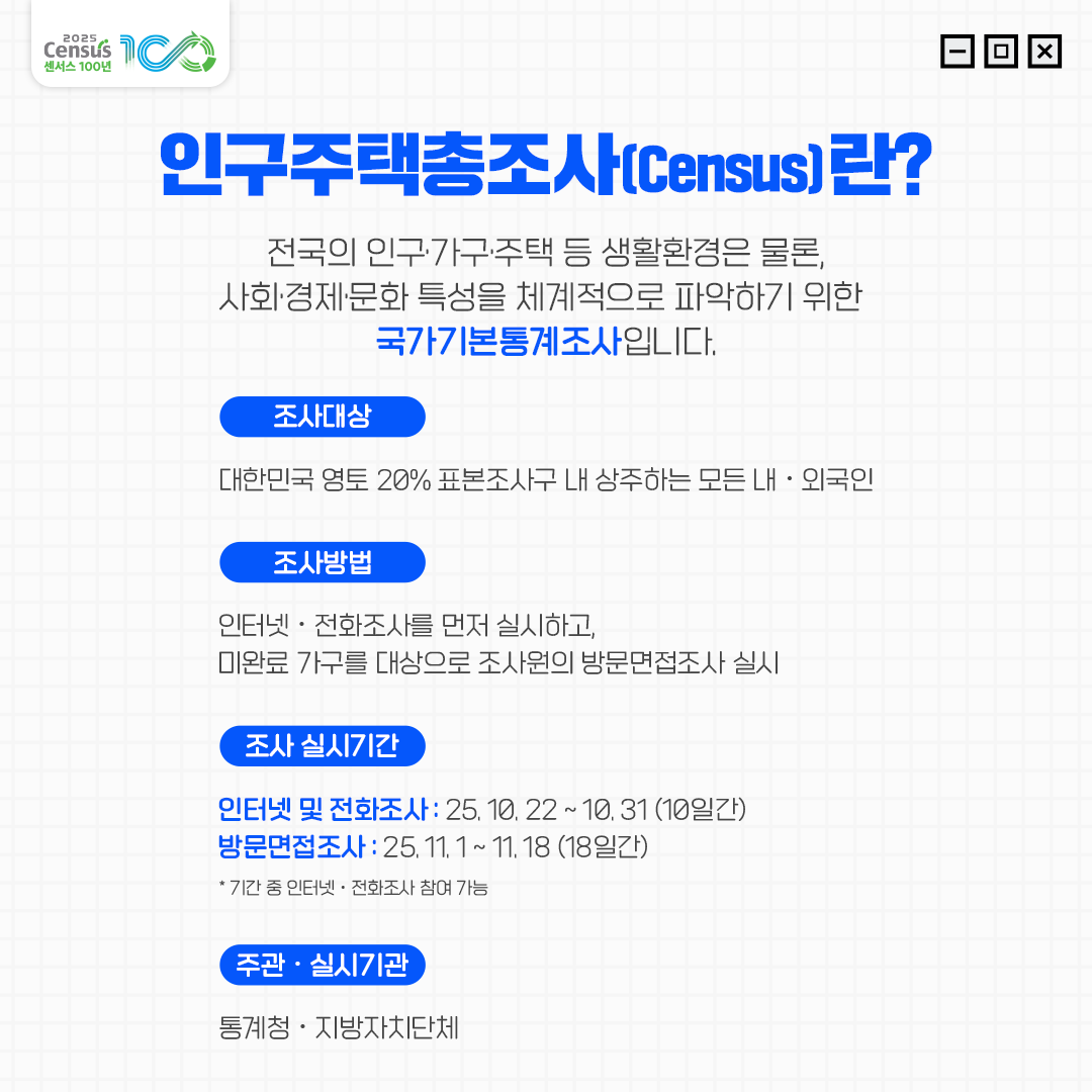 통계청이 주관해 5년마다 실시되는 인구주택총조사(표본)가 오는 10월부터 실시됩니다. 올해는 우리나라 센서스가 100년이 되는 해로 전국민의 20% 표본을 대상으로 현장조사를 진행하는데요. 이번 조사는 코로나 19 대유행 이후 대한민국 사회현상을 파악하는 첫 대규모 조사라는 점에서 더욱 의미가 깊습니다. 올해 실시되는 2025 인구주택총조사에 대해 알고 싶으면 본 카드뉴스를 참고해주세요
