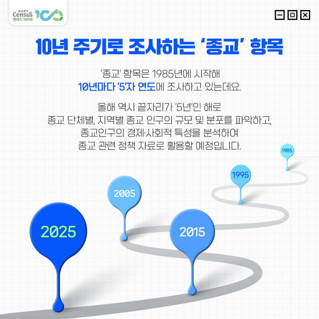 통계청이 주관해 5년마다 실시되는 인구주택총조사(표본)가 오는 10월부터 실시됩니다. 올해는 우리나라 센서스가 100년이 되는 해로 전국민의 20% 표본을 대상으로 현장조사를 진행하는데요. 이번 조사는 코로나 19 대유행 이후 대한민국 사회현상을 파악하는 첫 대규모 조사라는 점에서 더욱 의미가 깊습니다. 올해 실시되는 2025 인구주택총조사에 대해 알고 싶으면 본 카드뉴스를 참고해주세요