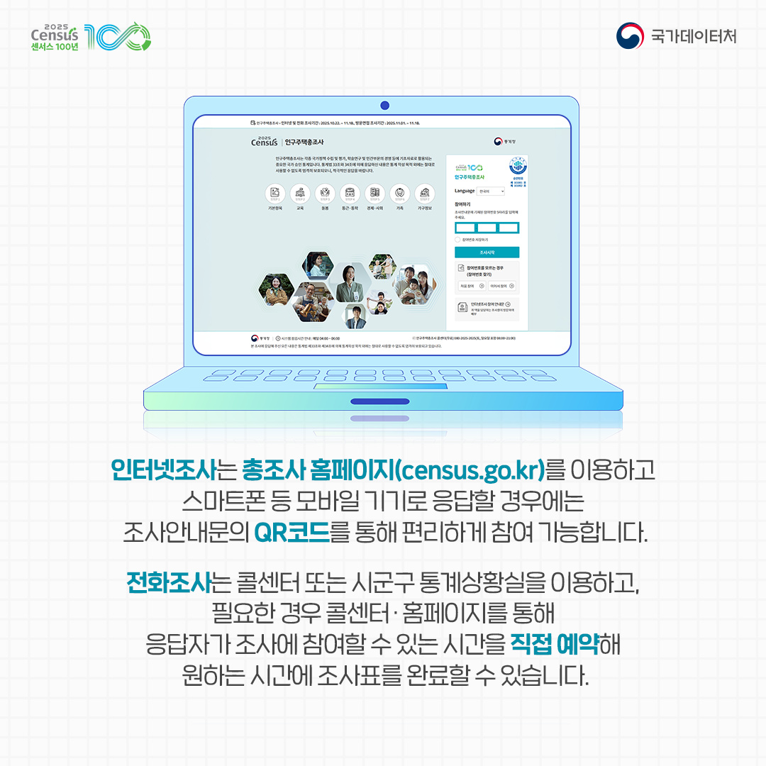 올해로 센서스 100년을 맞는 2025 인구주택총조사가 10월 22일부터 본격 시작됐습니다. 국가데이터처는 11월 18일까지 인구주택총조사를 전국 각지에서 동시에 실시할 예정입니다. 표본으로 선정되나 가구(전체 가구의 20%)는 우편 발송된 조사안내문의 참여번호를 이용해 인터넷조사와 전화조사에 참여할 수 있습니다.