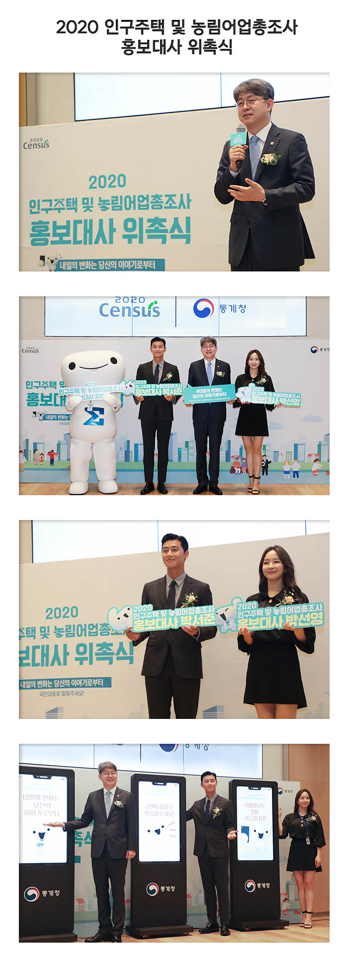 통계청(청장 강신욱)은 7월 8일(수) 서울 잠실 SKY31 컨벤션 오디토리움에서 ‘2020 인구주택 및 농림어업총조사' 홍보대사 위촉식을 개최하고 배우 박서준과 아나운서 박선영에게 위촉장을 수여했습니다. (2020. 7. 8.)