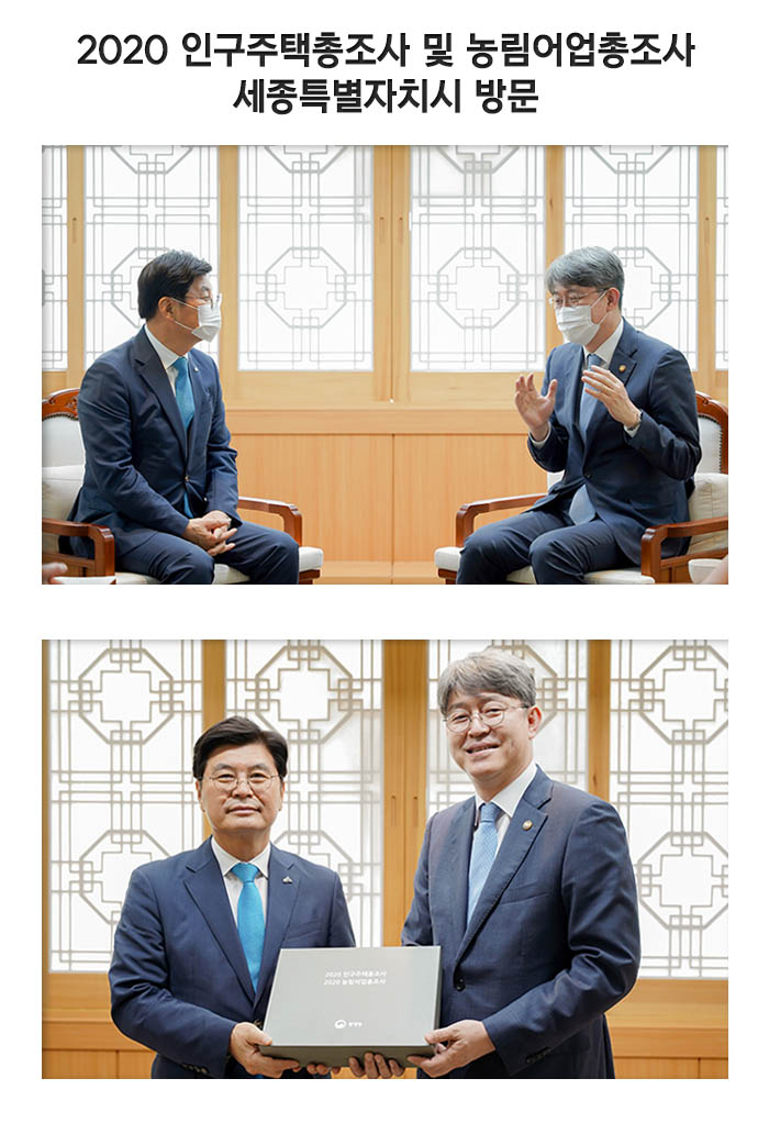 통계청(청장 강신욱)은 7월 31일(금) 세종특별자치시청을 방문하여 이춘희 세종특별자치시장과 올해 실시하는 2020 인구주택총조사 및 농림어업총조사와 지역통계에 대한 지원과 관심을 부탁드렸습니다. (2020. 7. 31.)