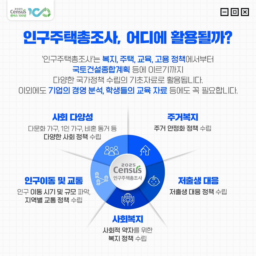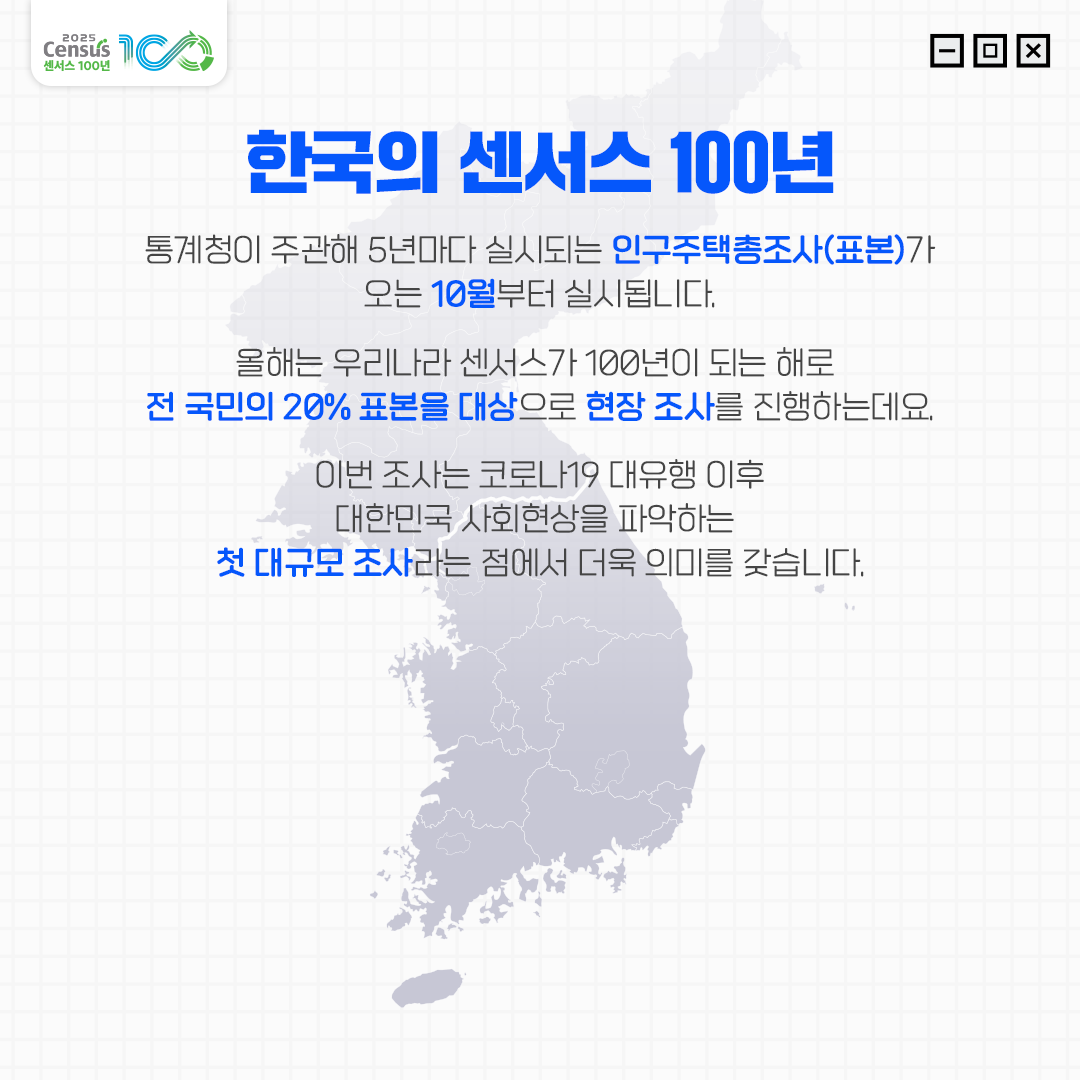 통계청이 주관해 5년마다 실시되는 인구주택총조사(표본)가 오는 10월부터 실시됩니다. 올해는 우리나라 센서스가 100년이 되는 해로 전국민의 20% 표본을 대상으로 현장조사를 진행하는데요. 이번 조사는 코로나 19 대유행 이후 대한민국 사회현상을 파악하는 첫 대규모 조사라는 점에서 더욱 의미가 깊습니다. 올해 실시되는 2025 인구주택총조사에 대해 알고 싶으면 본 카드뉴스를 참고해주세요