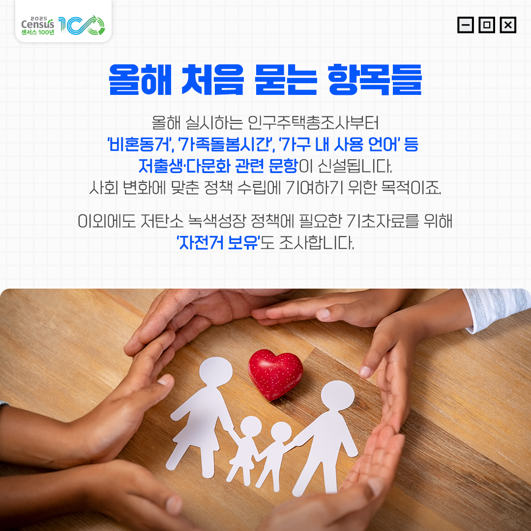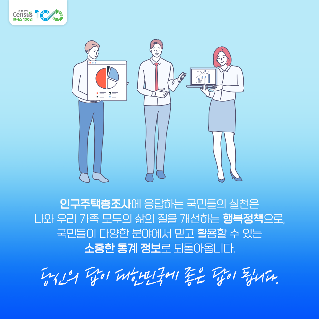 통계청이 주관해 5년마다 실시되는 인구주택총조사(표본)가 오는 10월부터 실시됩니다. 올해는 우리나라 센서스가 100년이 되는 해로 전국민의 20% 표본을 대상으로 현장조사를 진행하는데요. 이번 조사는 코로나 19 대유행 이후 대한민국 사회현상을 파악하는 첫 대규모 조사라는 점에서 더욱 의미가 깊습니다. 올해 실시되는 2025 인구주택총조사에 대해 알고 싶으면 본 카드뉴스를 참고해주세요