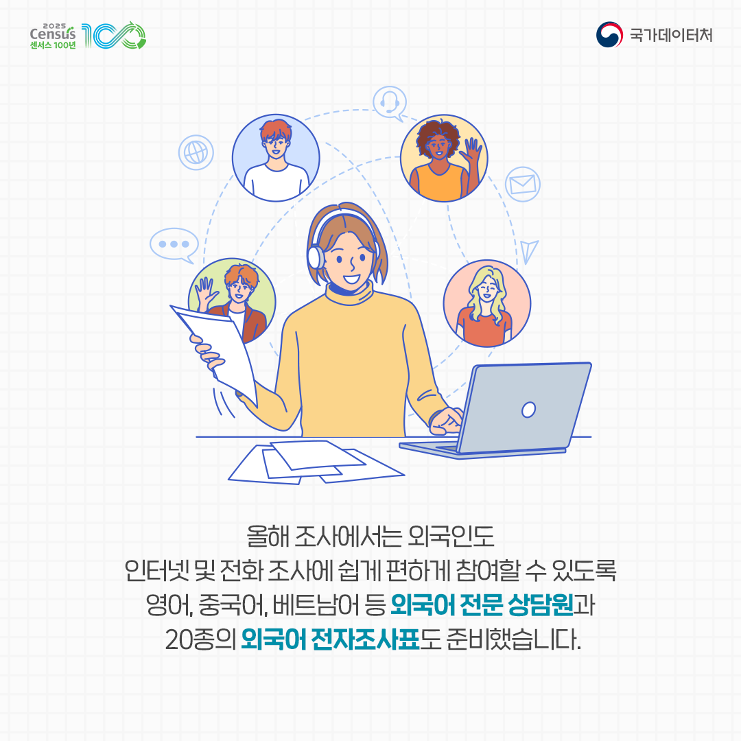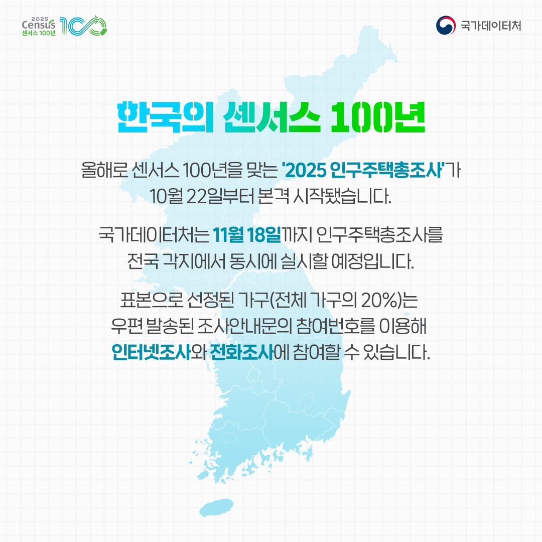 올해로 센서스 100년을 맞는 2025 인구주택총조사가 10월 22일부터 본격 시작됐습니다. 국가데이터처는 11월 18일까지 인구주택총조사를 전국 각지에서 동시에 실시할 예정입니다. 표본으로 선정되나 가구(전체 가구의 20%)는 우편 발송된 조사안내문의 참여번호를 이용해 인터넷조사와 전화조사에 참여할 수 있습니다.